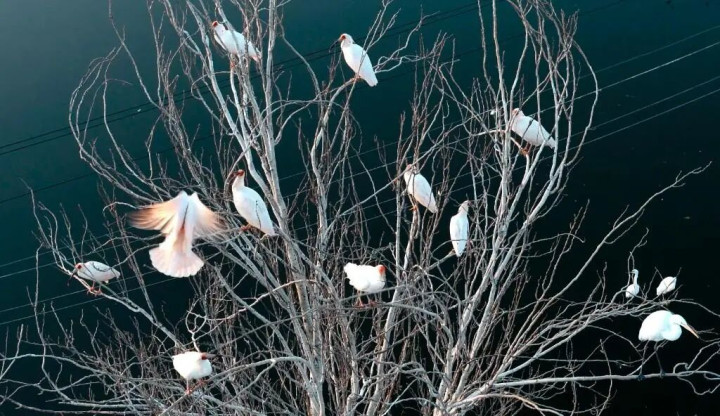 “平时就喜欢用无人机外出采风拍素材。”11月12日,摄影爱好者王东飞回忆起发现朱鹮的过程。11月7日下午,他原本计划前往槐树林中一棵银杏树旁取景,操控无人机飞行途中,突然发现树上聚集着大量鸟类,靠近后确认这些鸟是朱鹮。