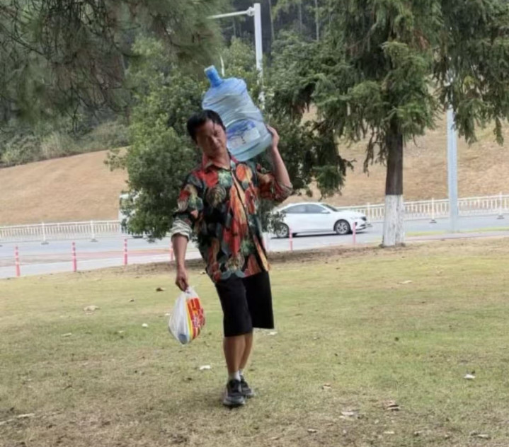 但现场层层叠叠的人和手机,让他决定“豁出去一把”。“我不装了,我就是来蹭流量的显眼包。”他向镜头投降,摊牌,把常年穿的绿色工服换成了藏蓝色短袖,搭配西装裤和油亮的皮鞋。水不卖了,他忙着当现场的“秩序大使”:帮排队的人递凳子,维持队伍秩序。